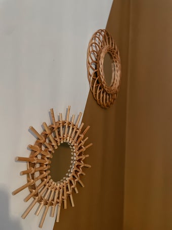 De spiegeltjes zijn een knappe touch. Neutraal en toch, doordat Lotte heeft gekozen voor twee verschillende ontwerpen, wat speelser. Het rotan staat prachtig bij het warme bruin op de muur.