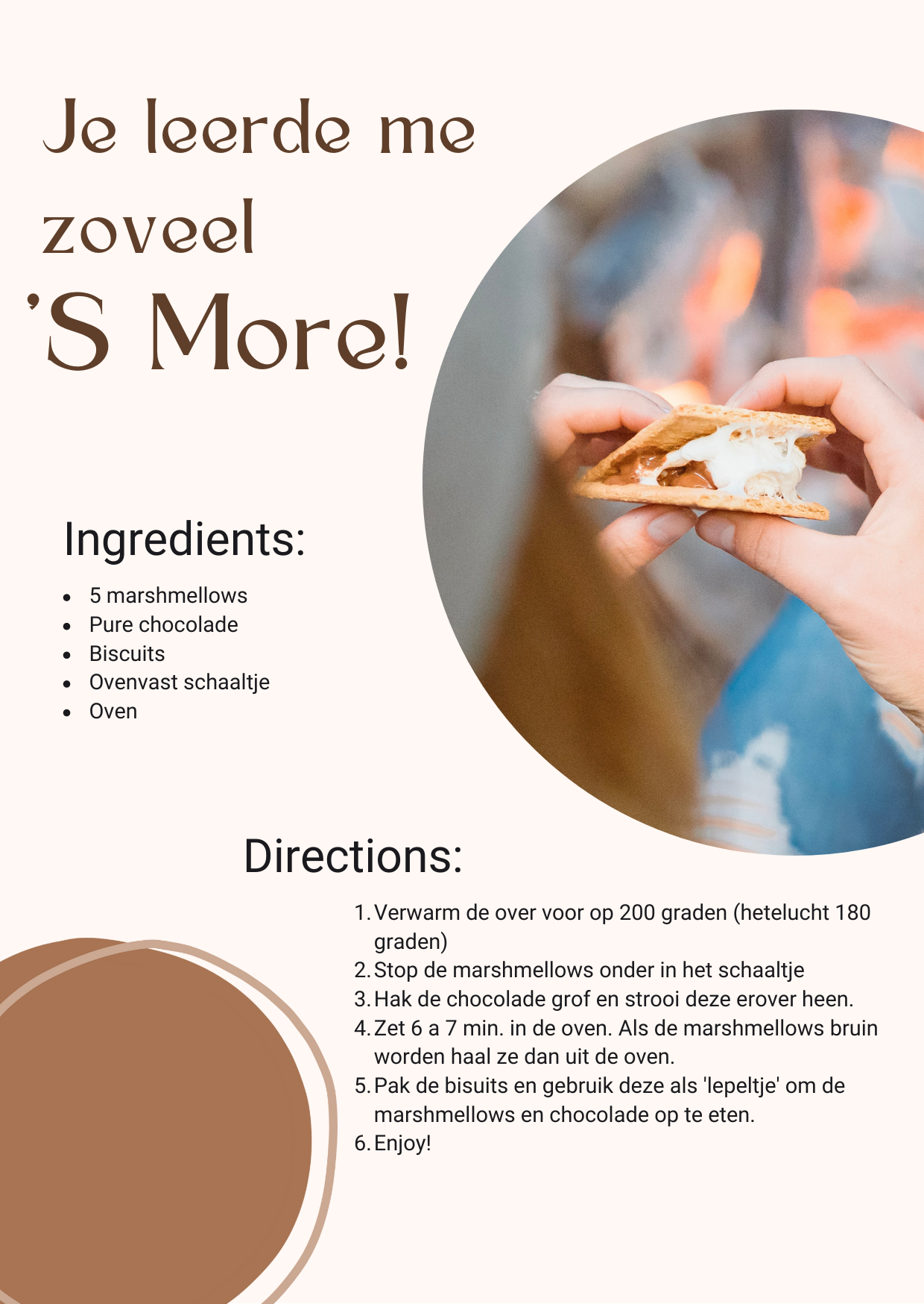 Je leerde me zoveel 's more! Maak een pakketje met: ovenvast schaaltje, een paar marshmallows, wat pure chocolade, biscuits en een klein receptenkaartje. Juf of meester kan nu zelf 's mores maken. Simpel en smakelijk. Zelf doen? Het receptenkaartje is gratis te downloaden! (gewoon even op klikken).